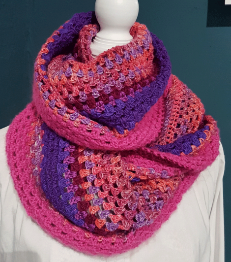 Kuscheliger Schlauchschal (Loop) in Pink und Lila. Der Schal ist als Möbius gehäkelt und kann auch als Schulterwärmer getragen werden.