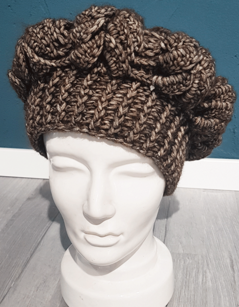 Mütze mit großem Zopfmuster aus Wolle und Acryl.