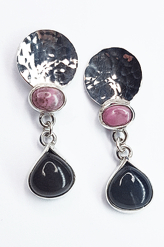 Wunderschöner Ohrschmuck in Silber 925/-. Die gehämmerte Ohrringschale wird begleitet von je einem ovalen Rhodochrosit 6x4 mm.Den Abschluss machen zwei beweglich angebrachte graue Mondsteintropfen 10,5 x 9,5 mm.