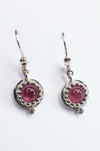 Zart und verspielt zeigen sich die rosa Turmalincabochons 6 mm rund in einem Kranz aus silbernem Perldraht, abgerundet mit je einem 2 mm großen, weißen Zirkonia.