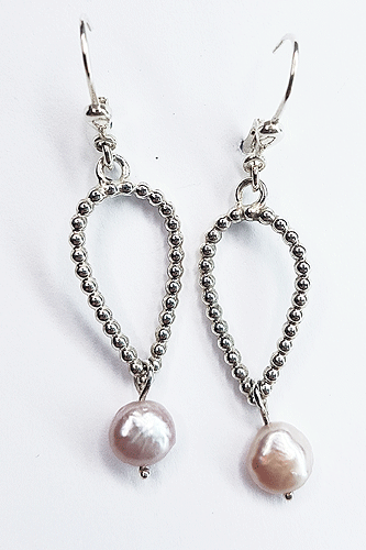 Elegante Ohrringe aus silbernem Perdraht 925/-. Den Abschluss des jeweiligen Tropfens macht je eine beweglich montierte rosa Süßwasserperle 7 mm.