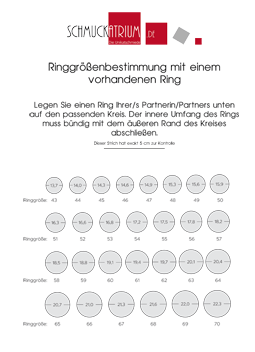 Ringgrößenschablone (PDF-Dokument) ausdrucken und vorhandenen Ring auflegen. Die Außenkante der Kreise müssen zum Messen mit dem Innendurchmesser des aufgelegten Rings übereinstimmen.